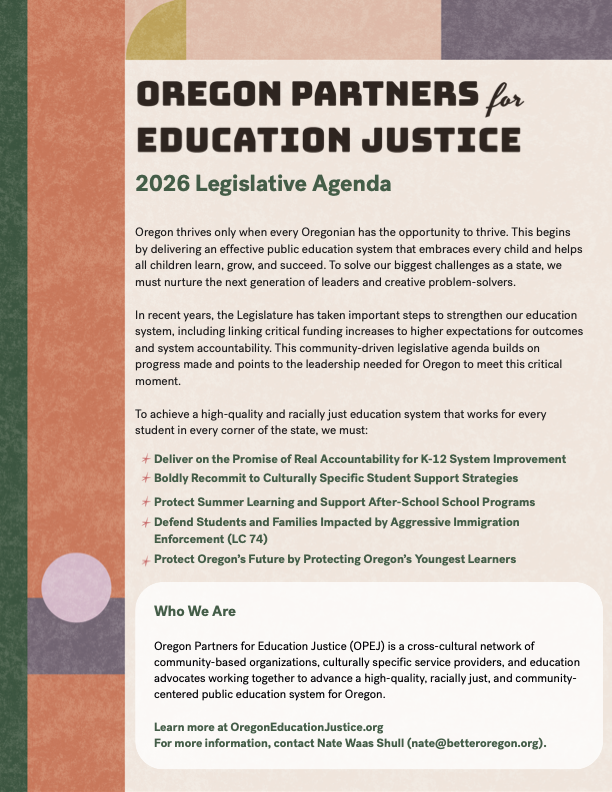 The Oregon Partners for Education Justice (OPEJ) is a cross-cultural network of community-based organizations, culturally specific service providers, and education advocates working together to advance a high-quality, racially just, and community-centered public education system for Oregon.